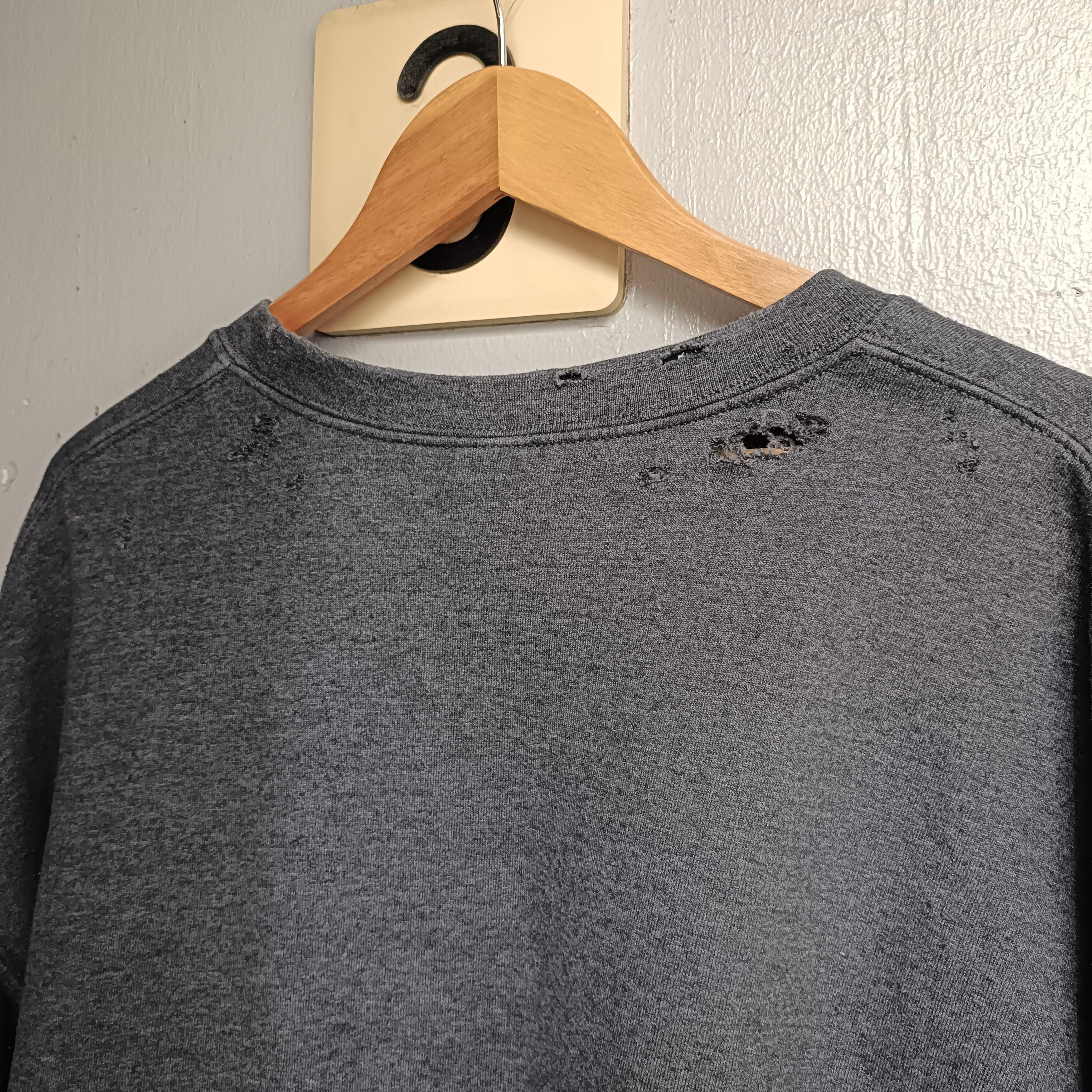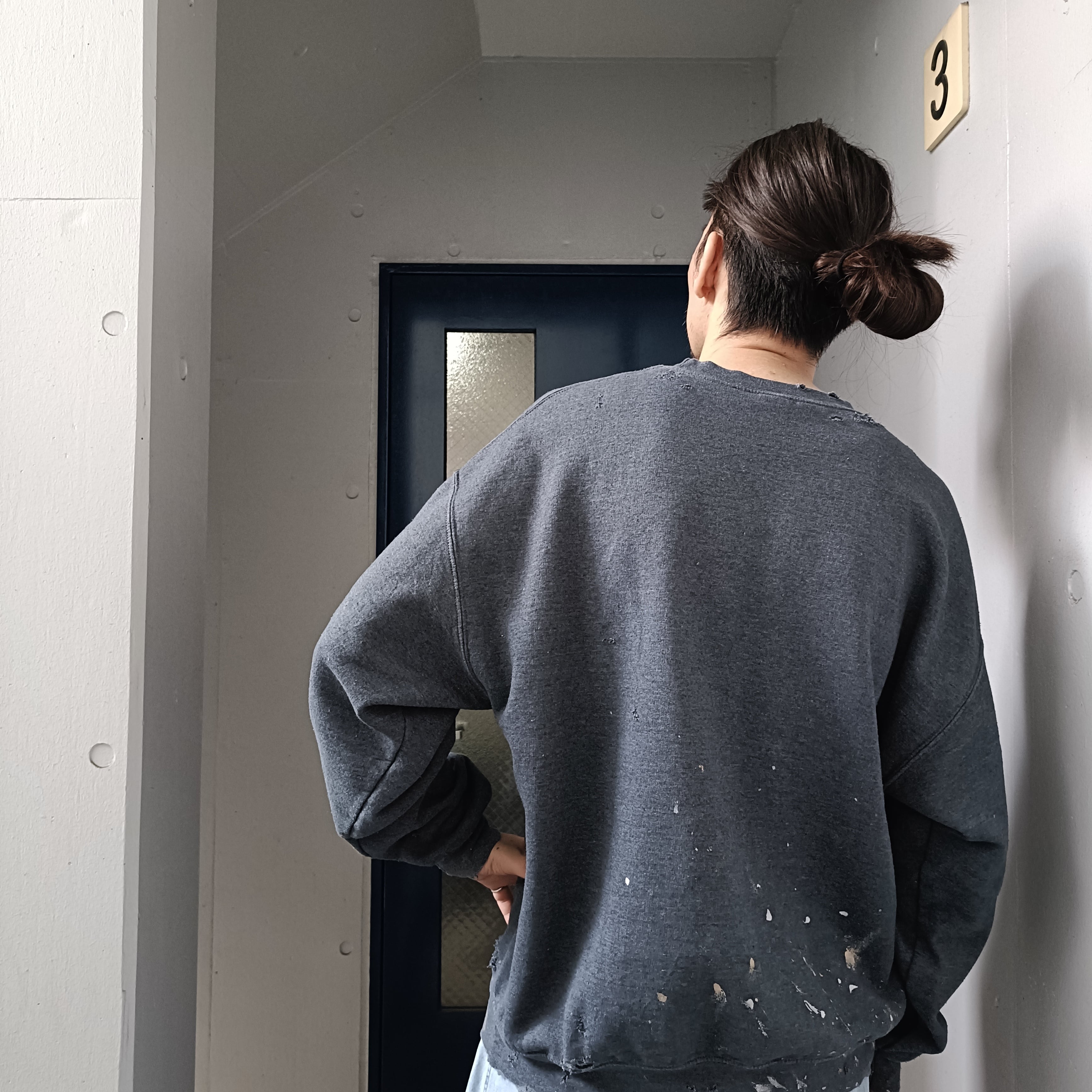 なんてことないGILDANの無地スウェット。シルエットが良かったけど無地でつまらないのでリメイクしました。ダメージ、ペイントを加え今っぽいモダンな雰囲気をプラス。XLのオーバーサイズで身幅広め、着丈短めのボクシーシルエット。